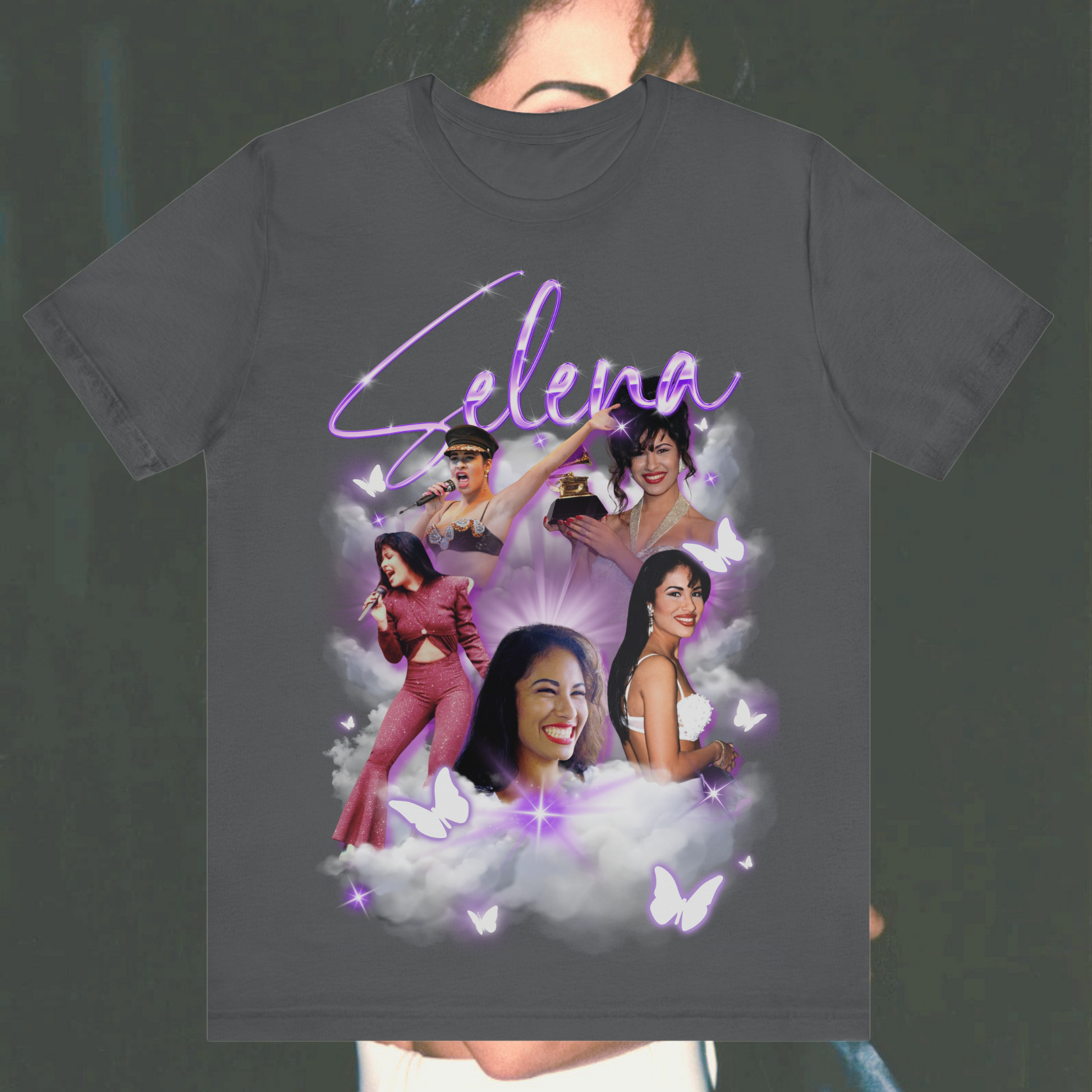 Celebrate the timeless legacy of Selena Quintanilla with this captivating collage t-shirt! Featuring iconic images of the Queen of Tejano music, this tee is perfect for fans who want to honor her unforgettable style and spirit. Designed with a dreamy cloud and butterfly motif, it’s a bold and nostalgic piece for casual wear, concerts, or as a collectible. Grab yours now and keep the memory of Selena shining bright! Ideal for Selena fans, music lovers, and those who adore vibrant graphic tees.